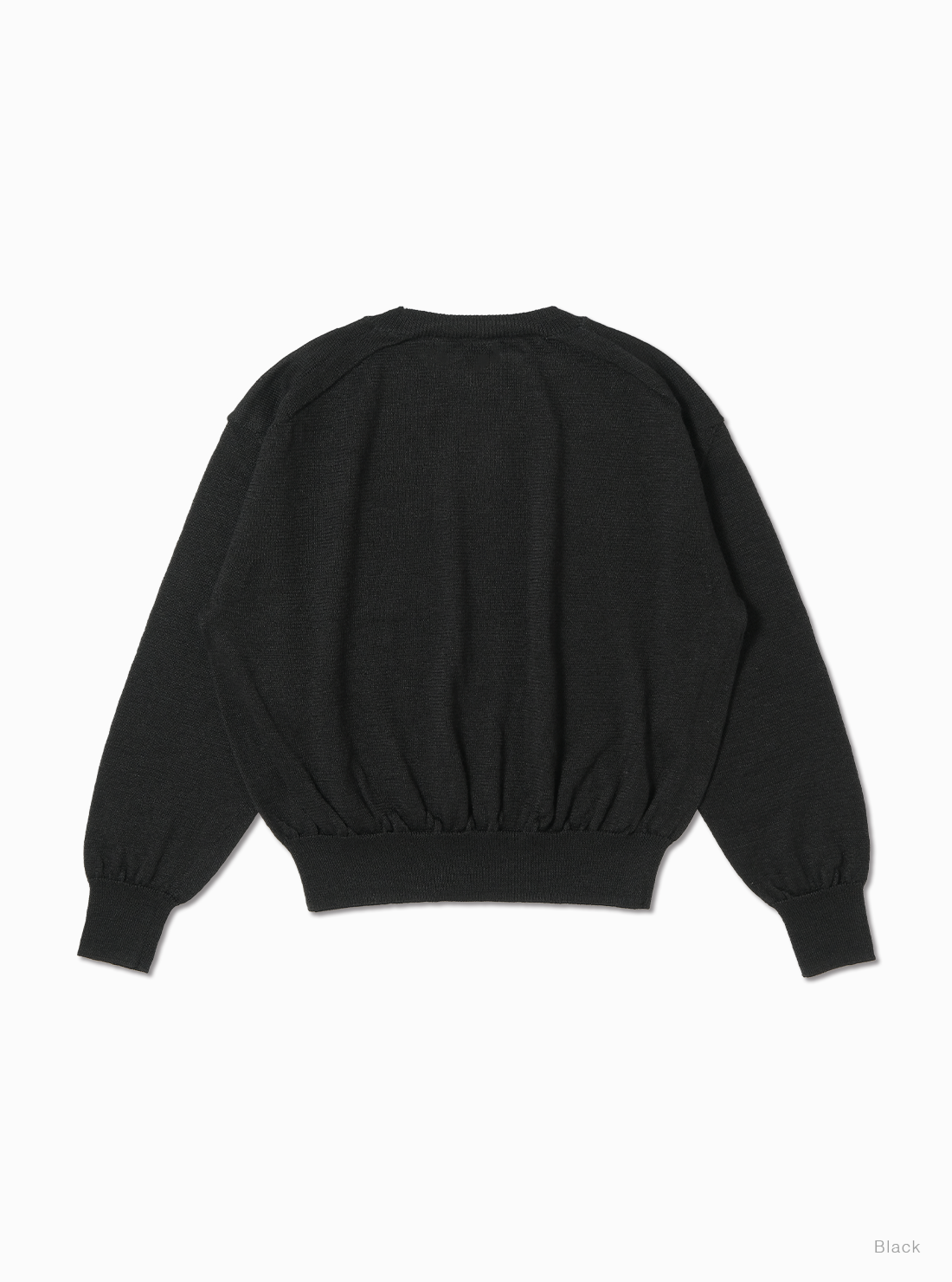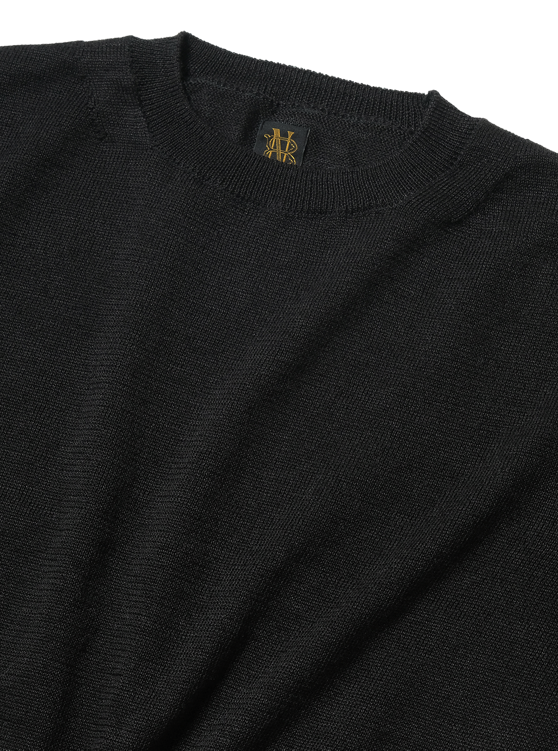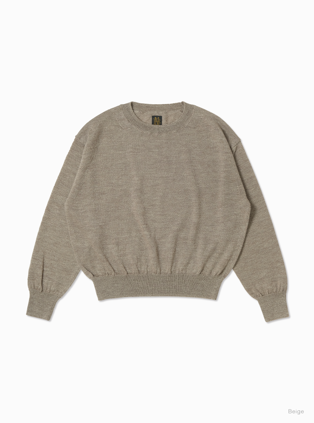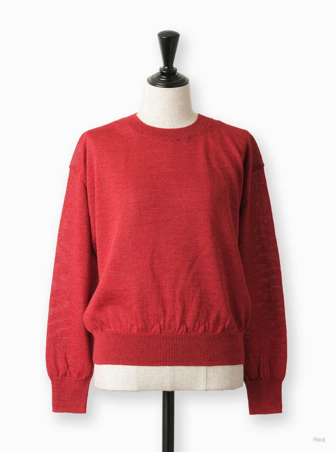 細番手のラミーと細番手のウールの梳毛を撚糸した糸を、あえてゆるく編んだ透け感のある商品。ラミーを採用することによりハリコシを保ちながら、さりげないシアー感とラミーならではのざっくりした表情・清涼感のある商品。