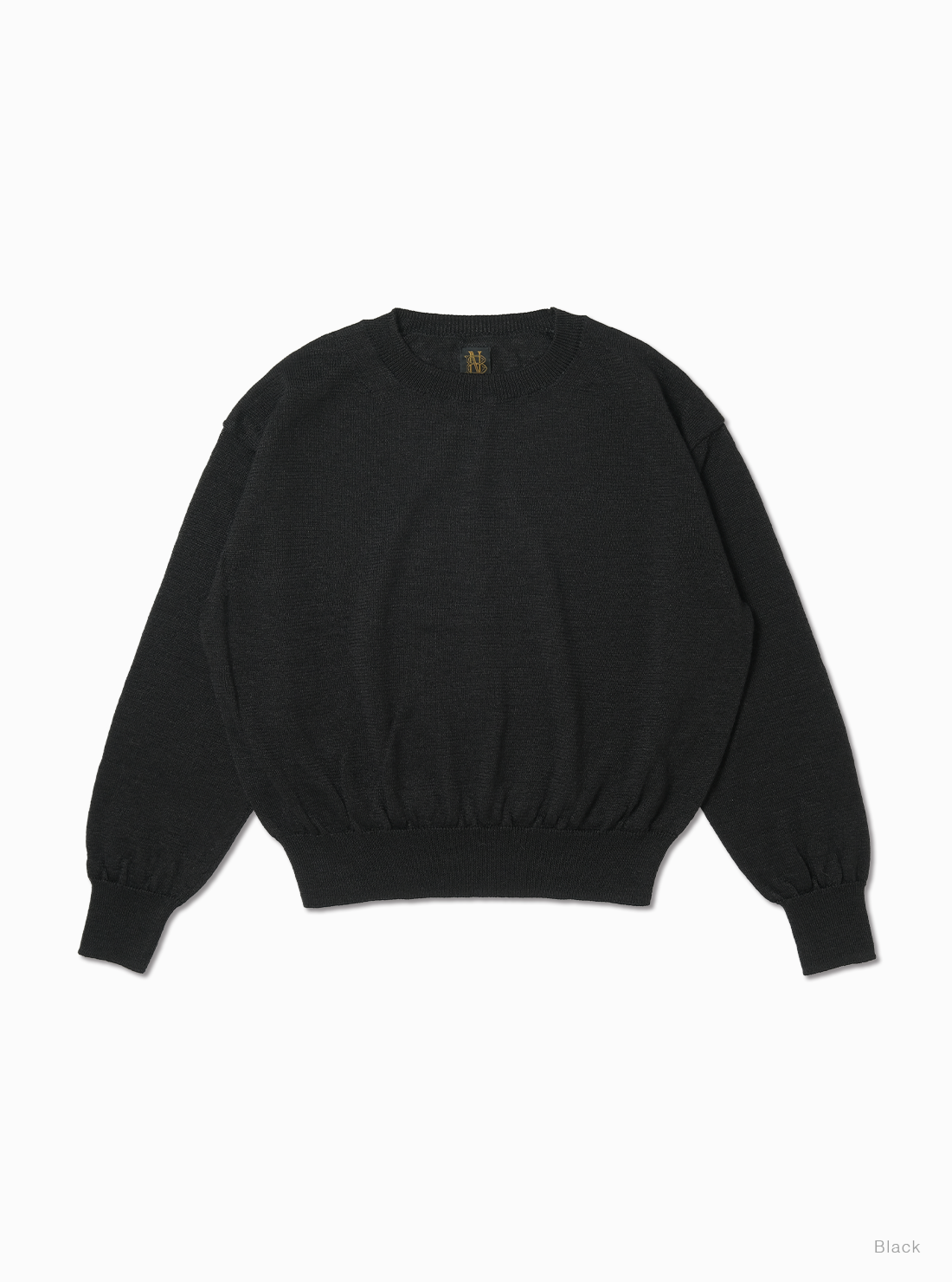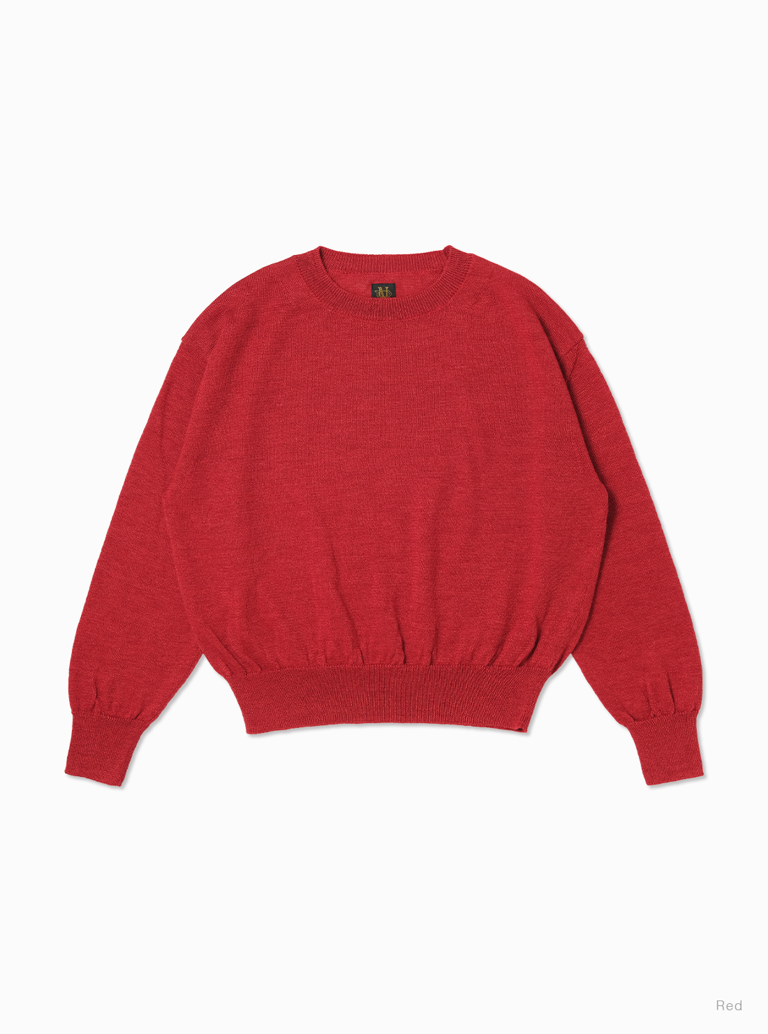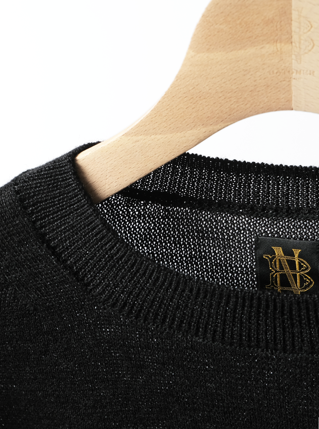 細番手のラミーと細番手のウールの梳毛を撚糸した糸を、あえてゆるく編んだ透け感のある商品。ラミーを採用することによりハリコシを保ちながら、さりげないシアー感とラミーならではのざっくりした表情・清涼感のある商品。