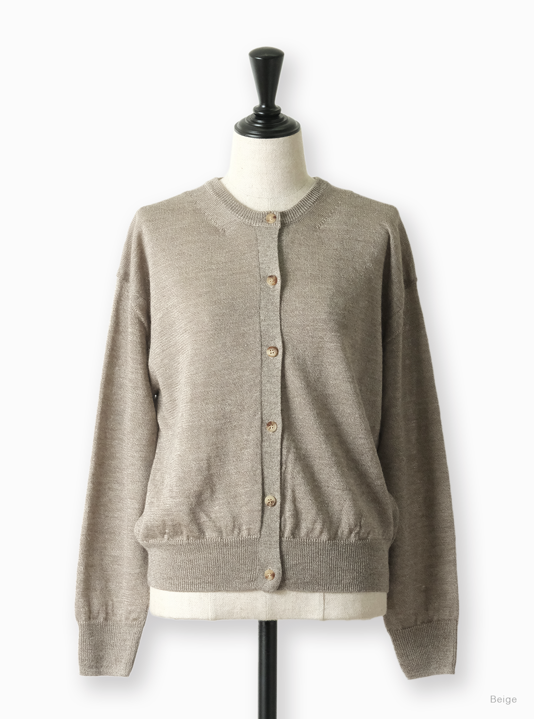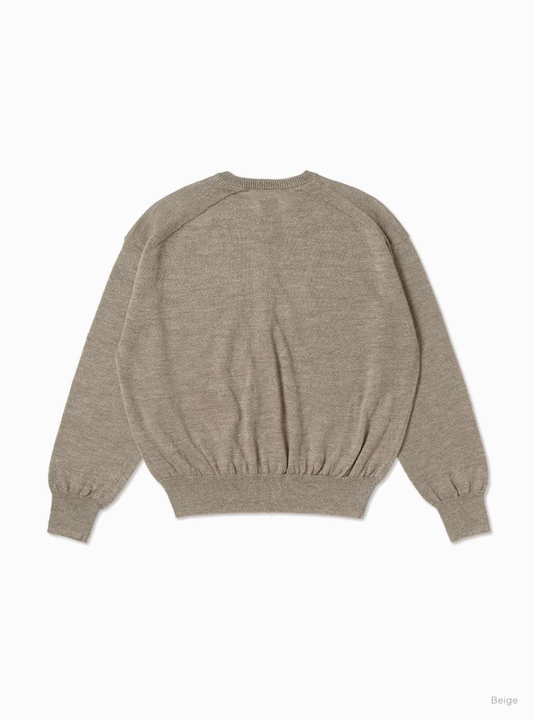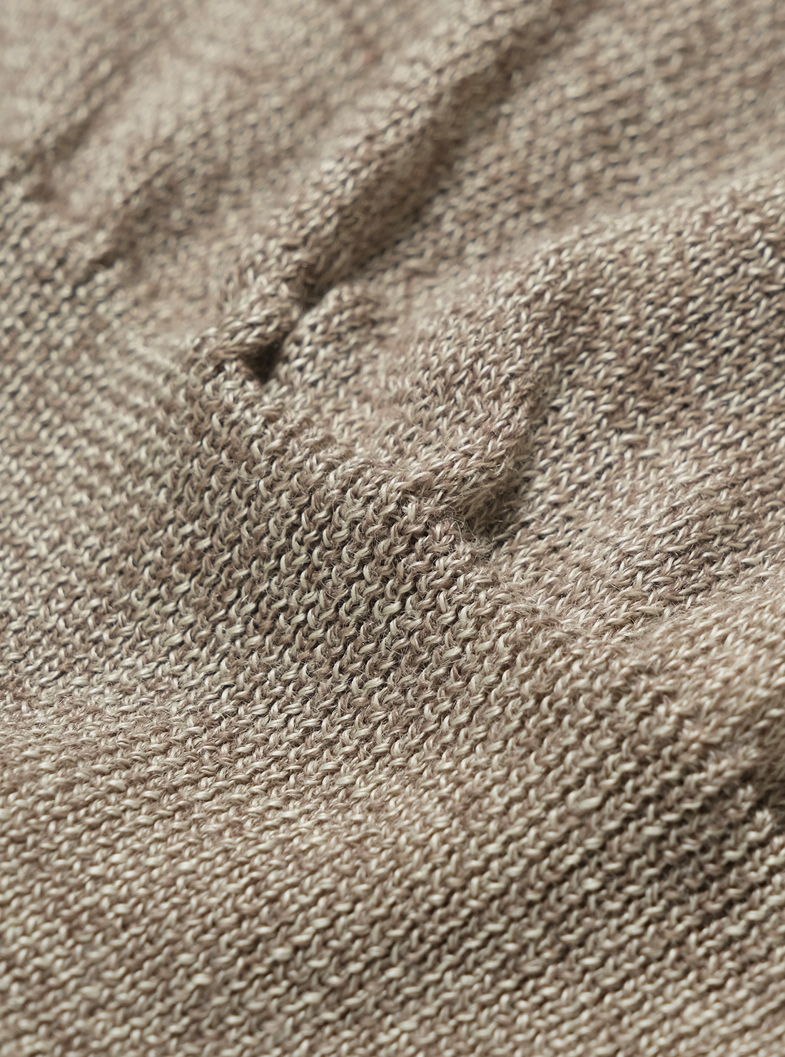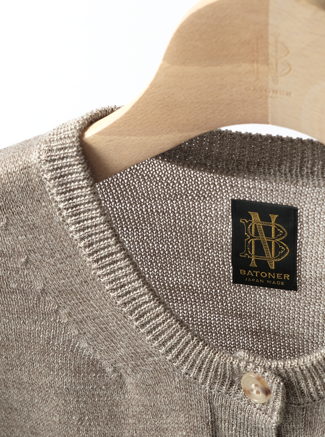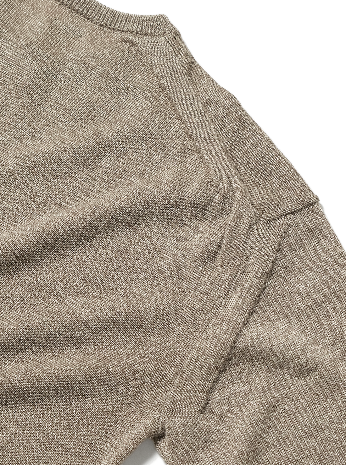 細番手のラミーと細番手のウールの梳毛を撚糸した糸を、あえてゆるく編んだ透け感のある商品。ラミーを採用することによりハリコシを保ちながら、さりげないシアー感とラミーならではのざっくりした表情・清涼感のある商品。