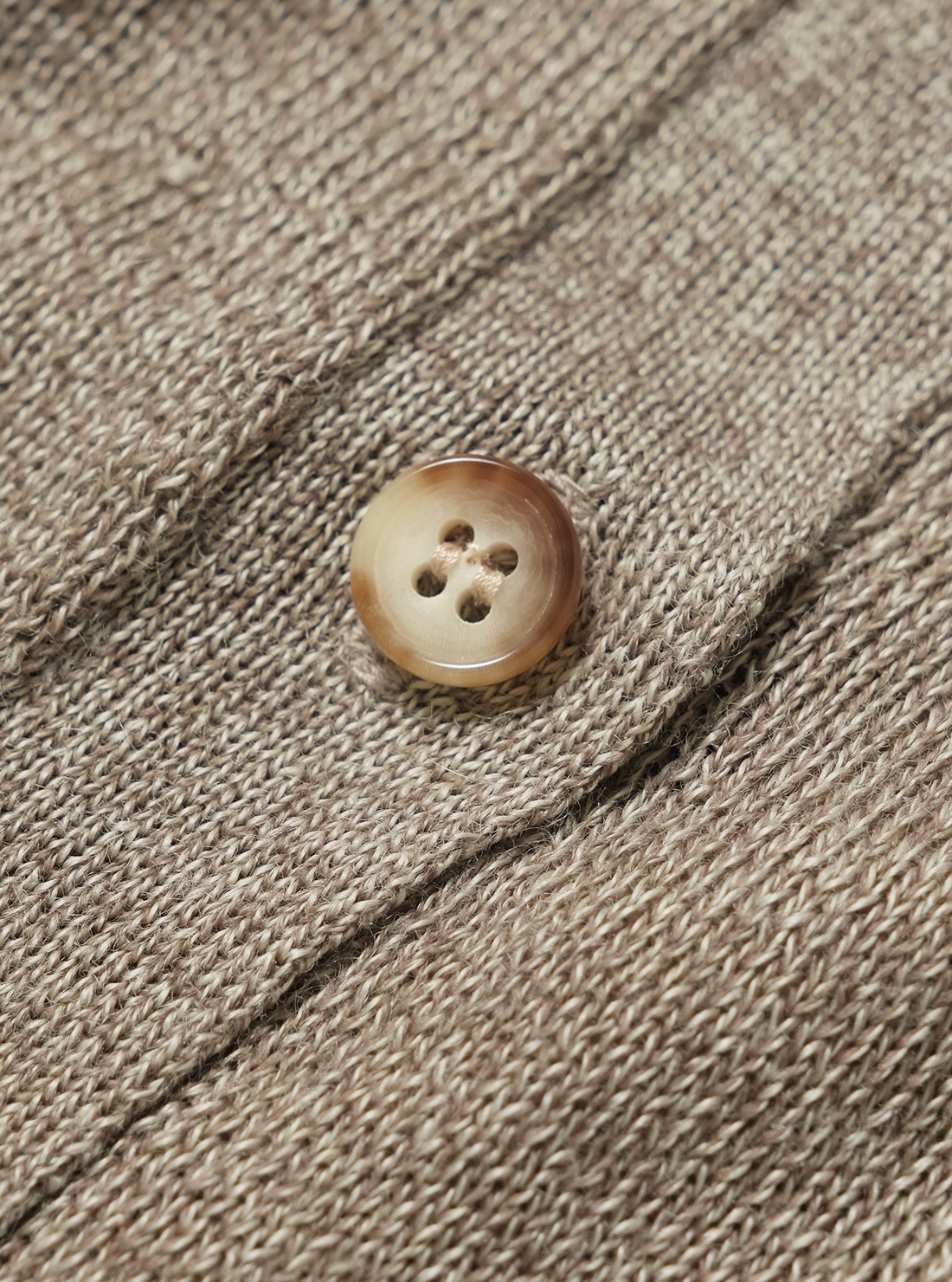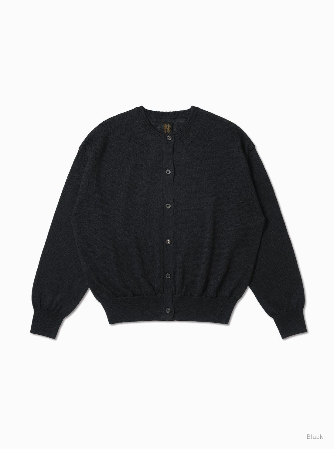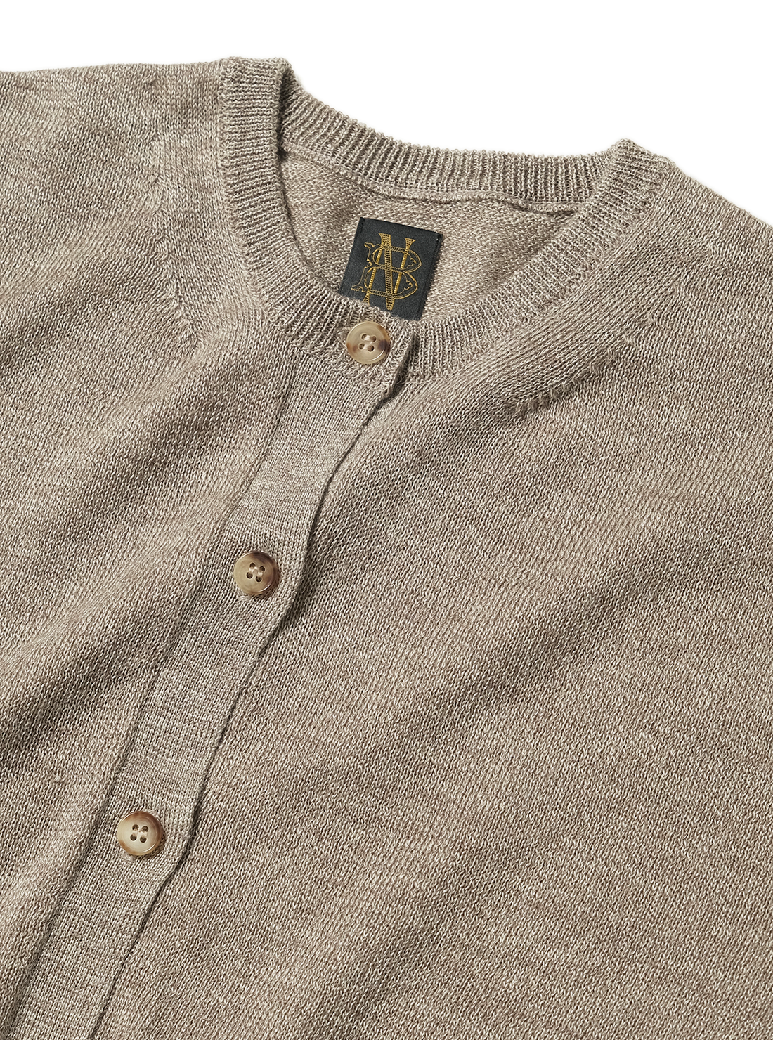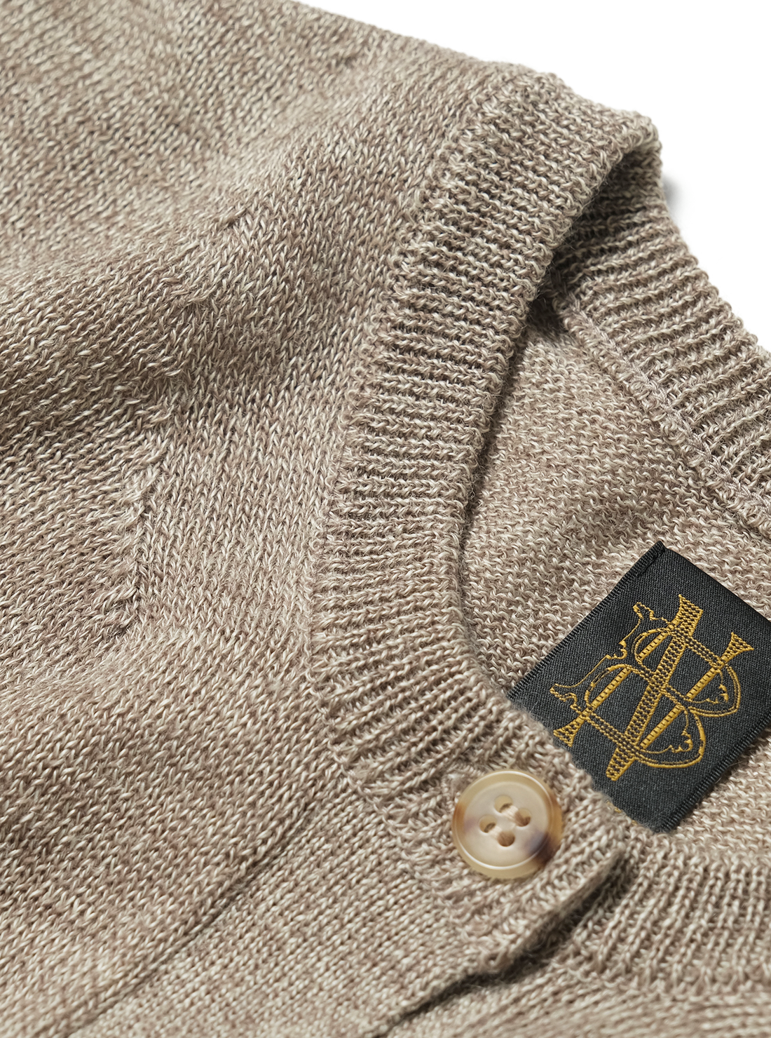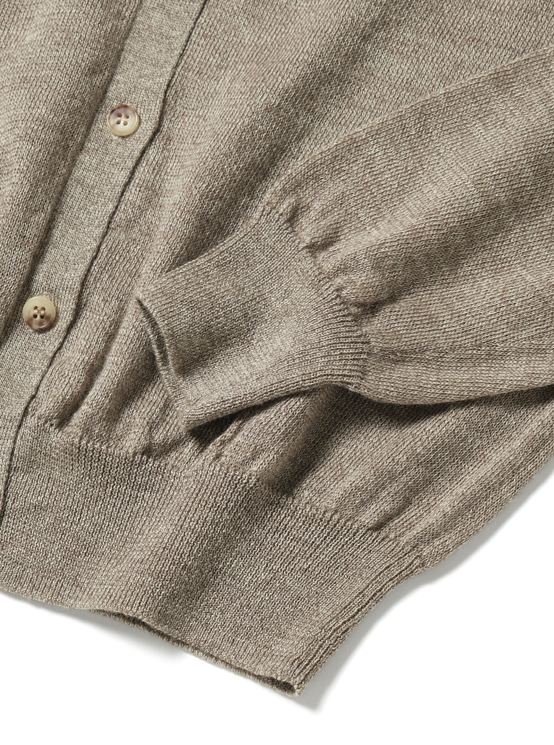細番手のラミーと細番手のウールの梳毛を撚糸した糸を、あえてゆるく編んだ透け感のある商品。ラミーを採用することによりハリコシを保ちながら、さりげないシアー感とラミーならではのざっくりした表情・清涼感のある商品。