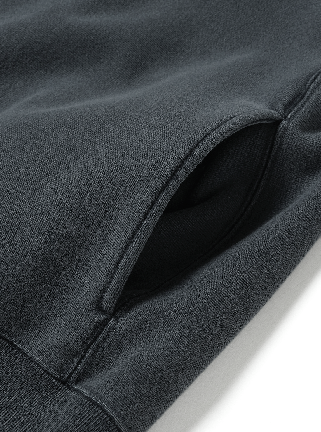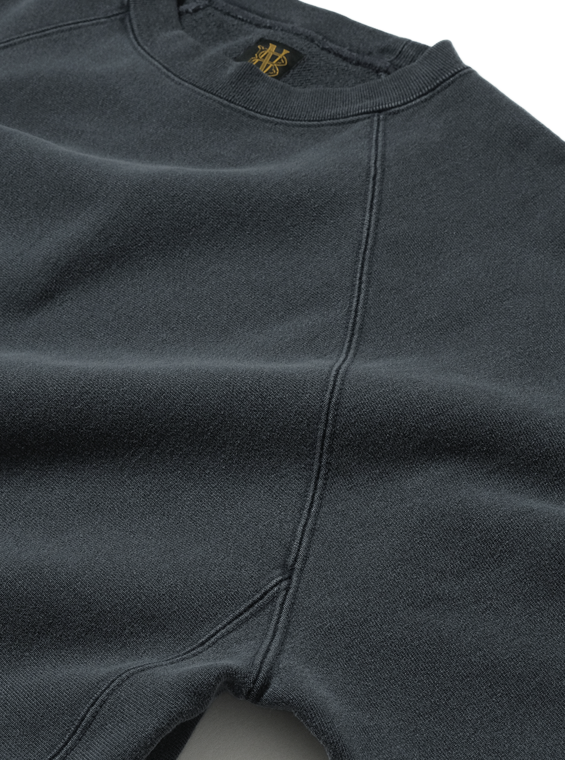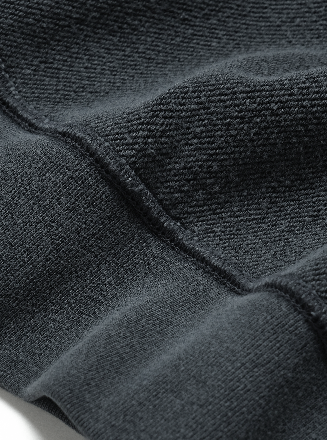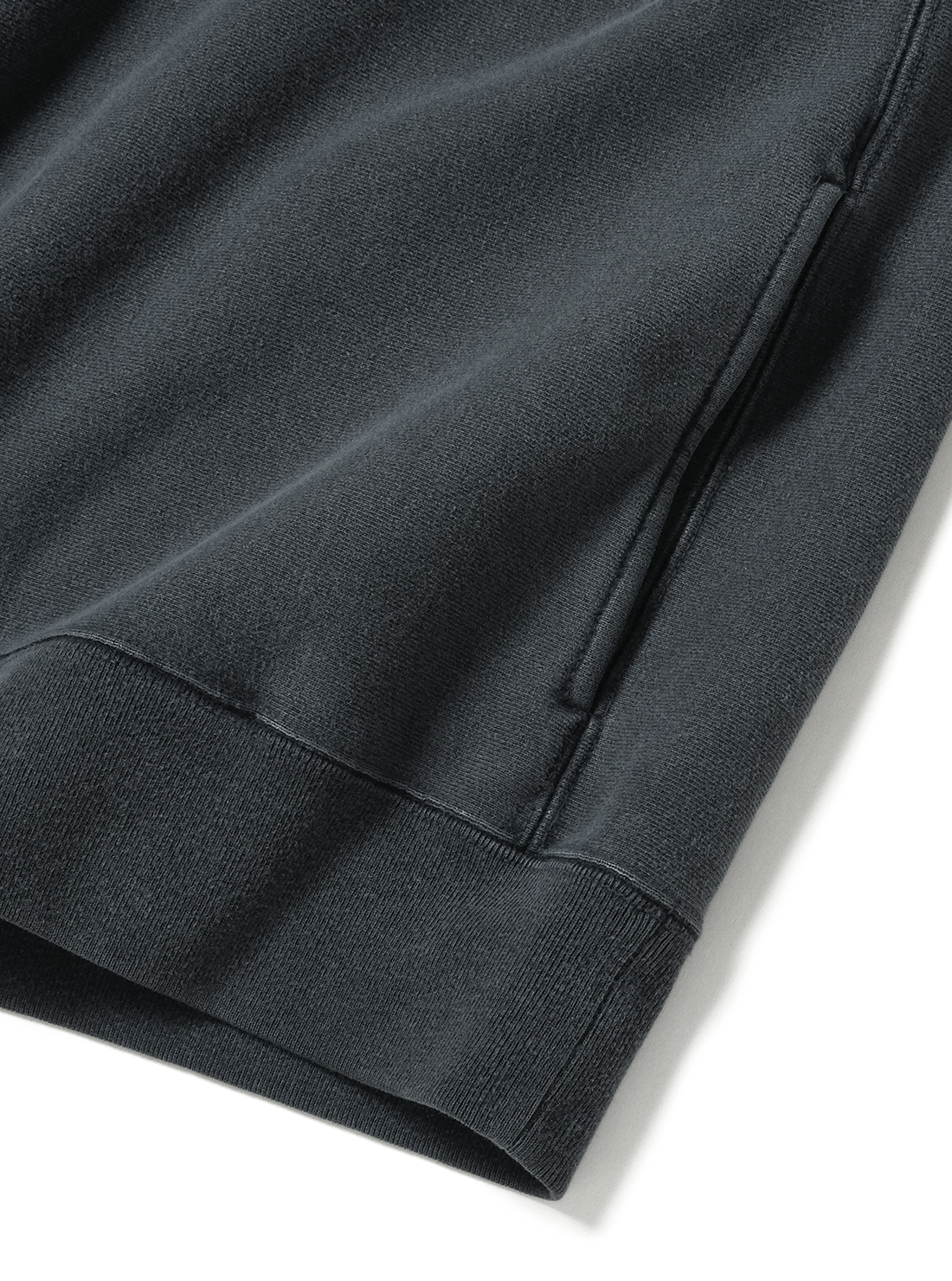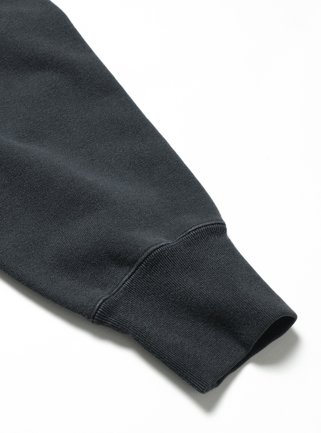 希少な旧式編機“ジャンベルカ”を使用し、時間をかけて丁寧に編むことで独特のキックバック性と程よい肉感のある商品。表側に空気紡績糸を使用し、軽さとタフさを持たせ、裏側にはソフトな糸を使用。裏起毛をしないことで軽やかに仕上げた商品。後染め加工を施し、その後に色を落とすことで独自のフェード感を実現した商品。