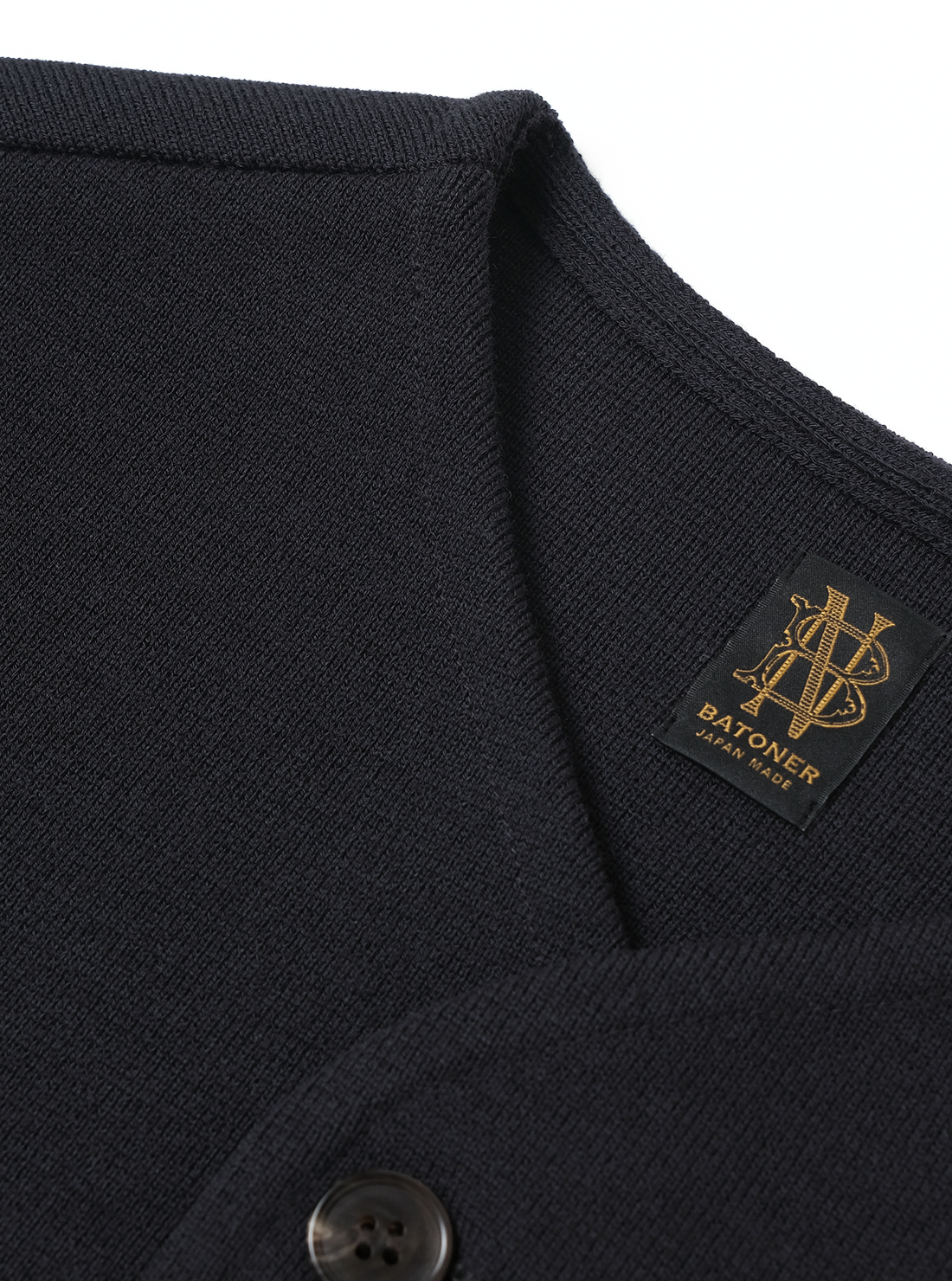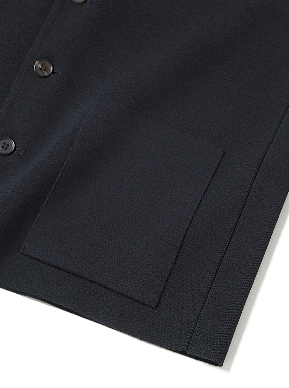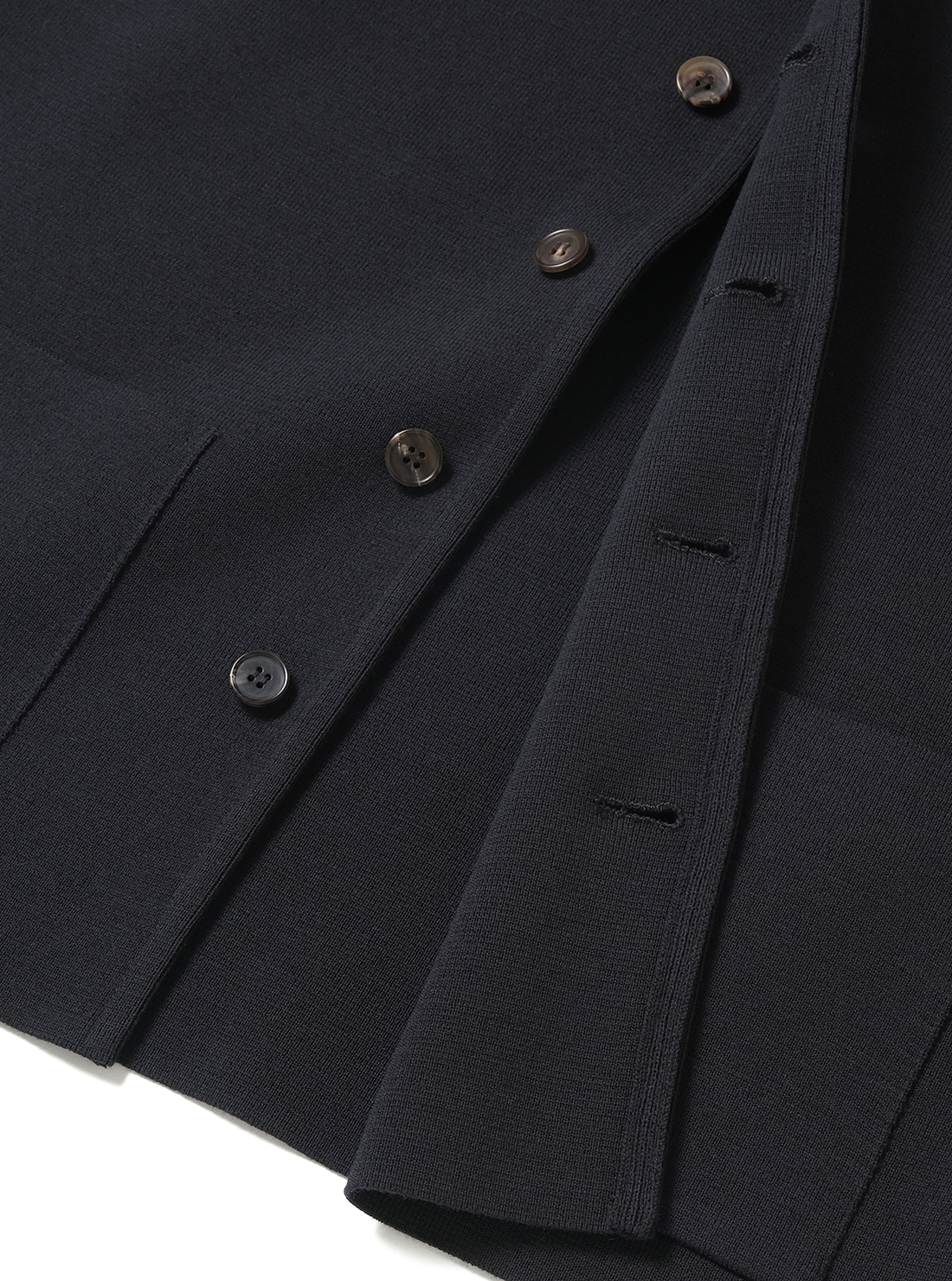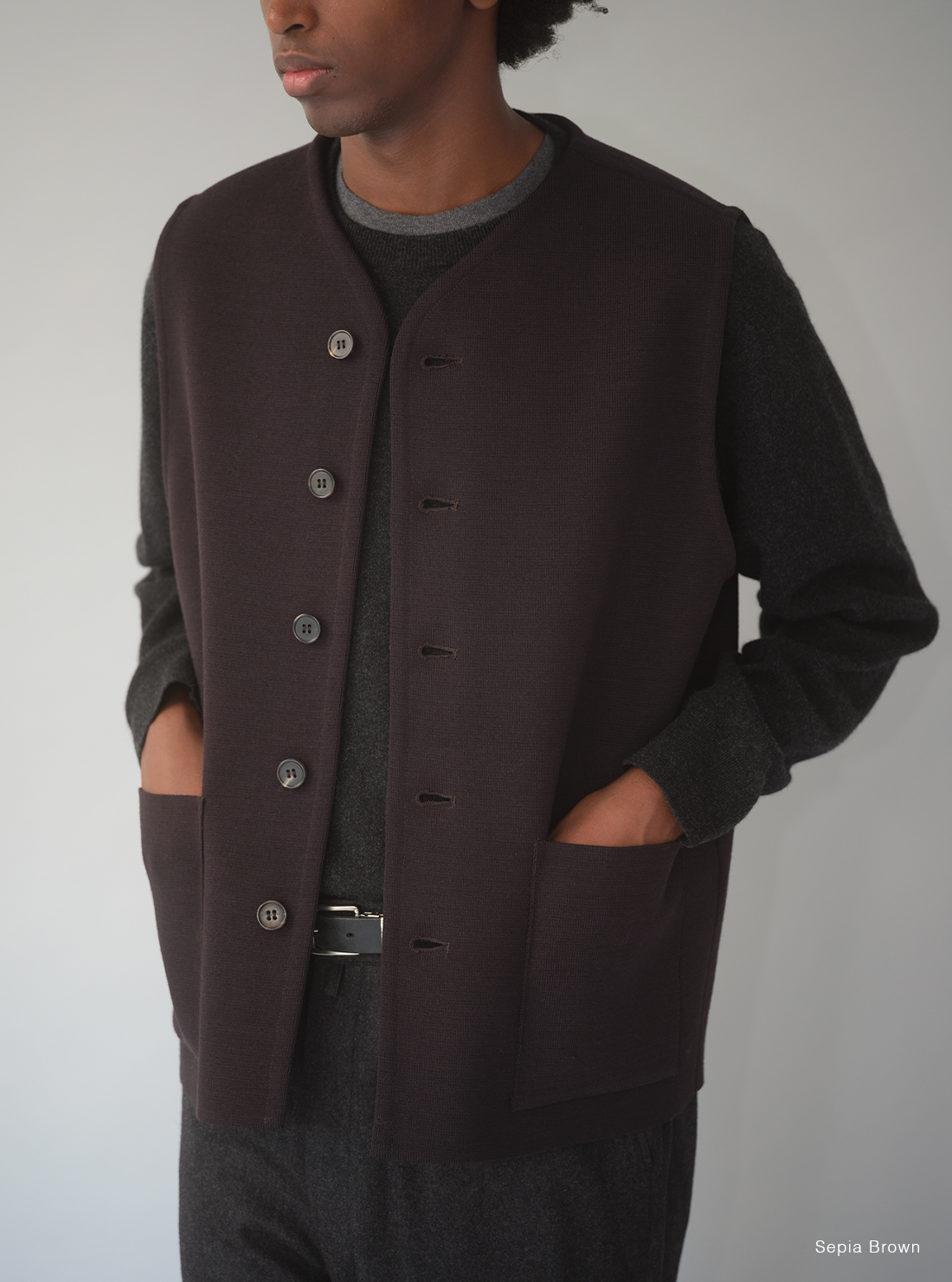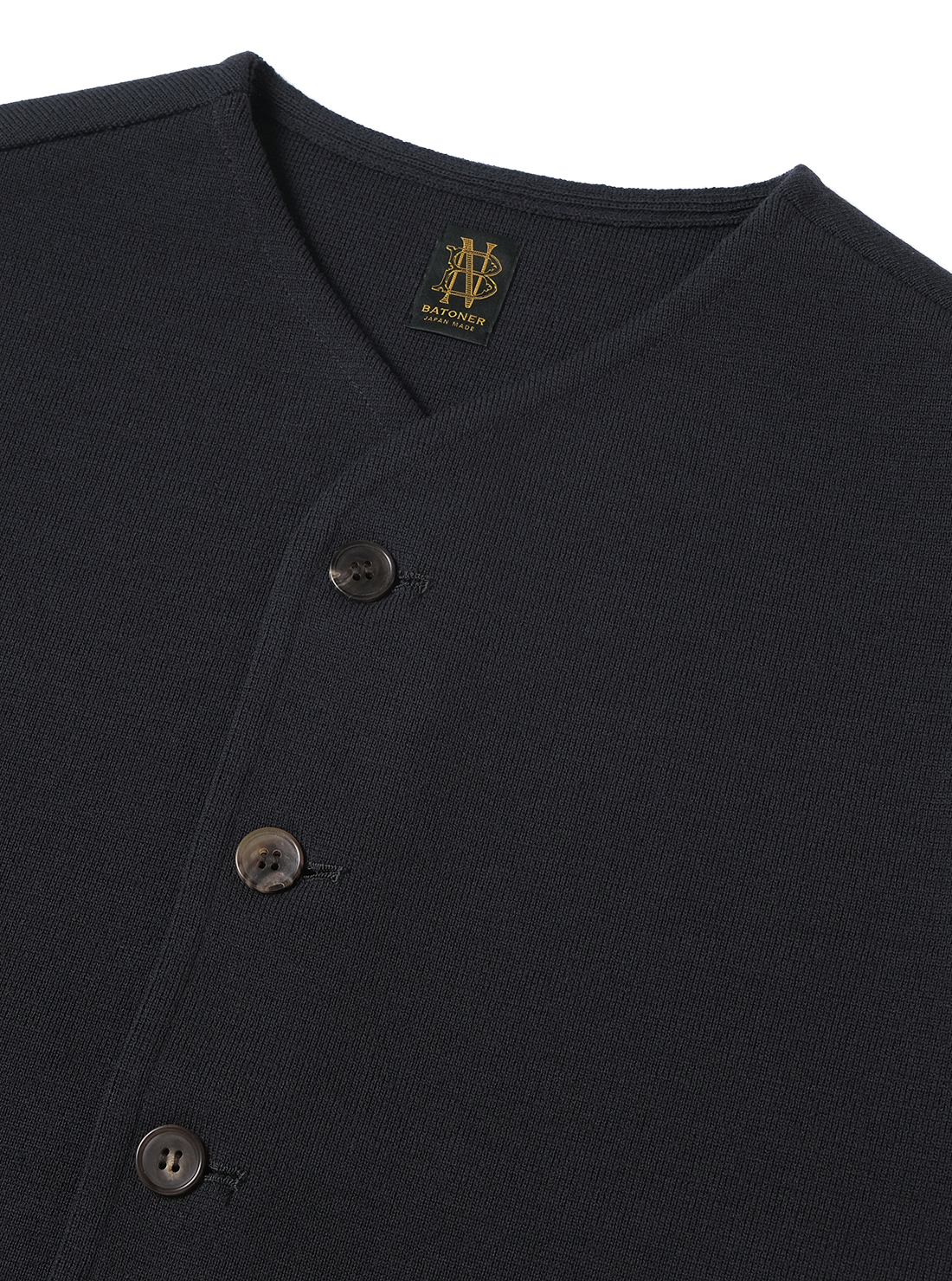 スペインを起源とするメリノウールの持つドライな風合いと膨らみを活かした糸を使用。非常に高密度に編み込まれたミラノリブ組織により、約1kgの重量感と洗練されたフォルム、高い耐久性を実現。ニットアウターの新たな可能性を追求した商品。