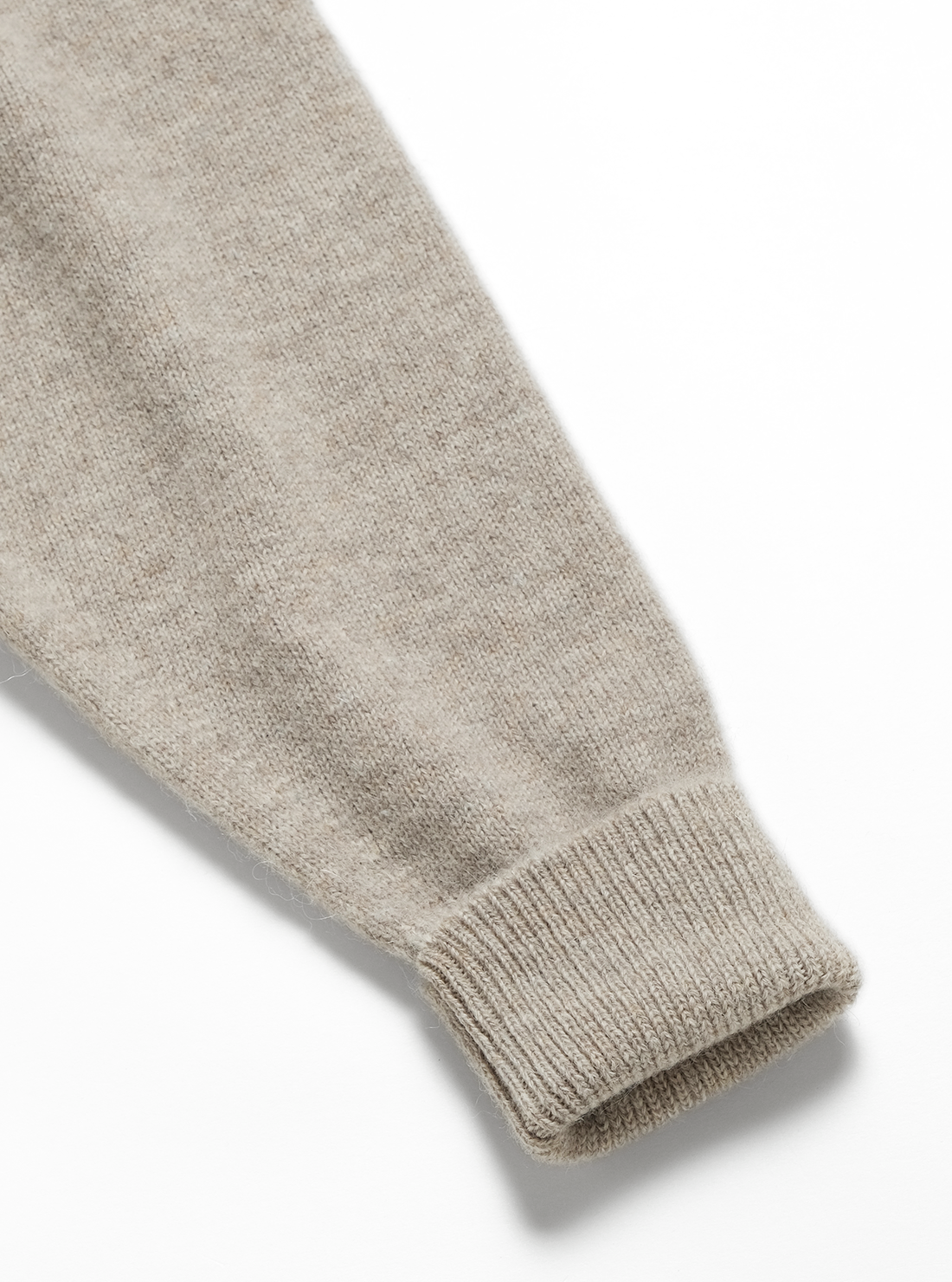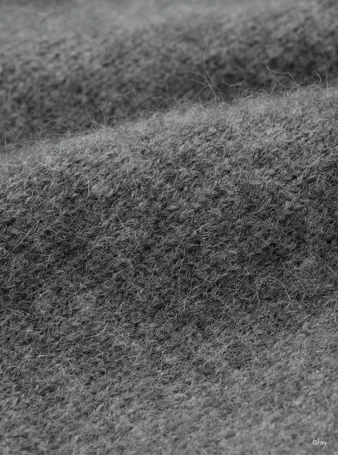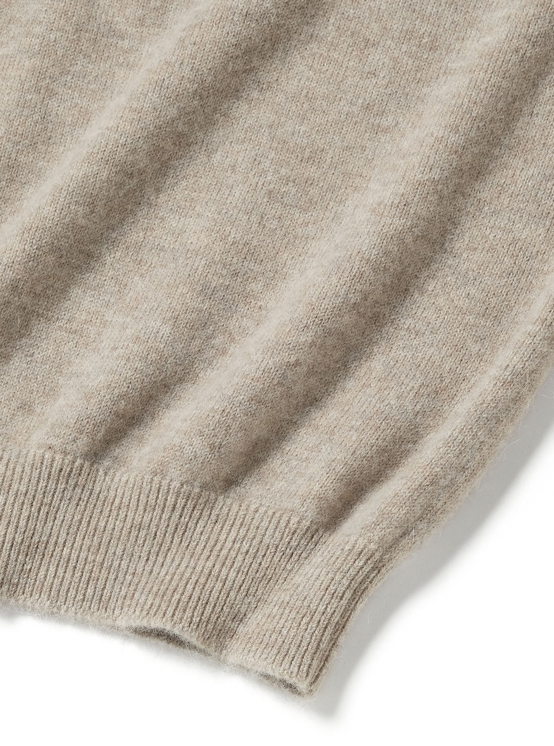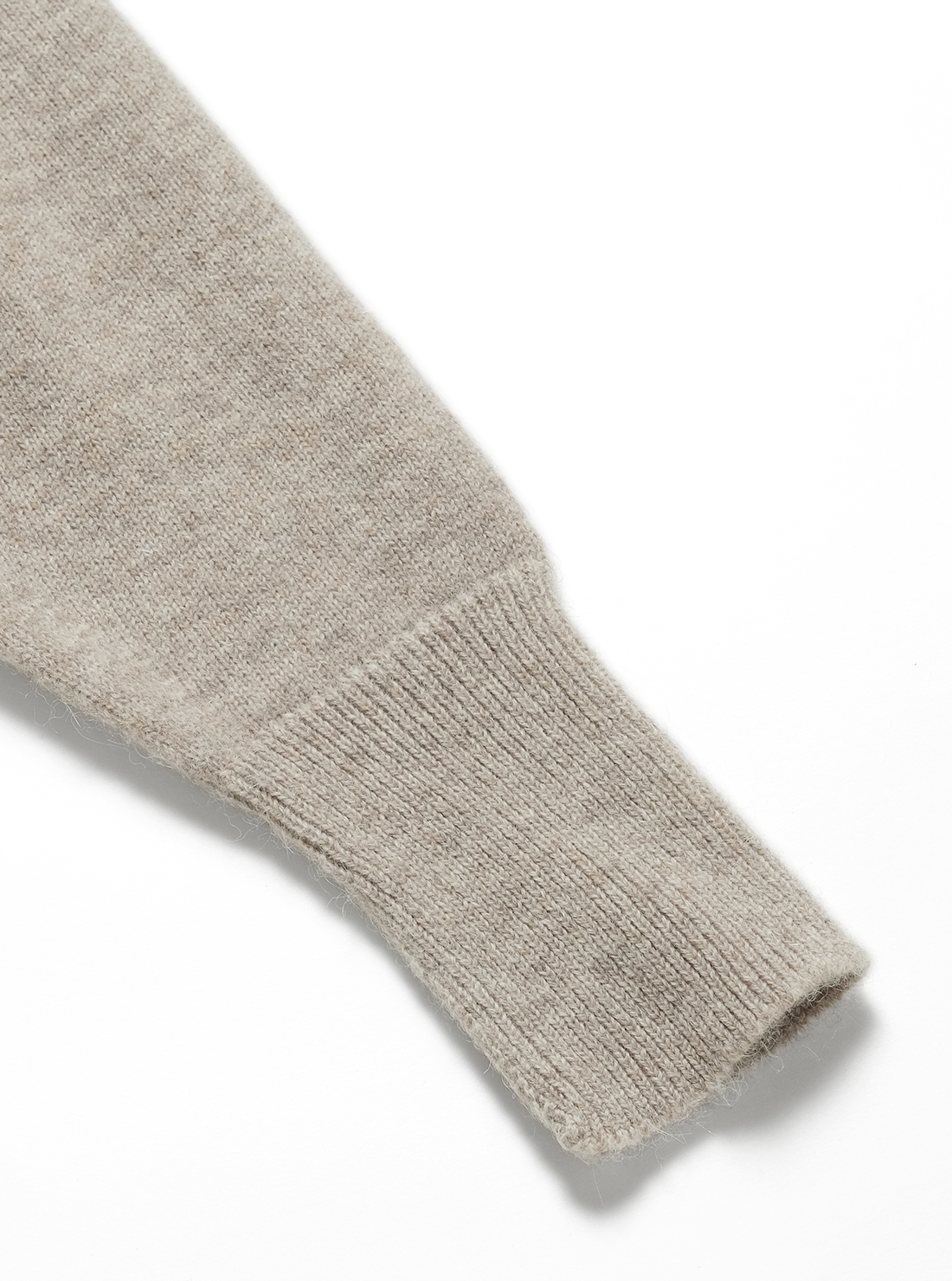 良質なベビーアルパカを絶妙な色差で染め分け、クルミ編みで仕上げた独特の雰囲気を持つ商品。表糸と裏糸にあえて異なる色を用いることで、表裏で異なる表情が生まれ、立体感と深みのある風合いが特徴。ベビーアルパカならではの膨らみと空気感が生む、温かさが魅力。袖リブは長めで折り返しても着用可能。