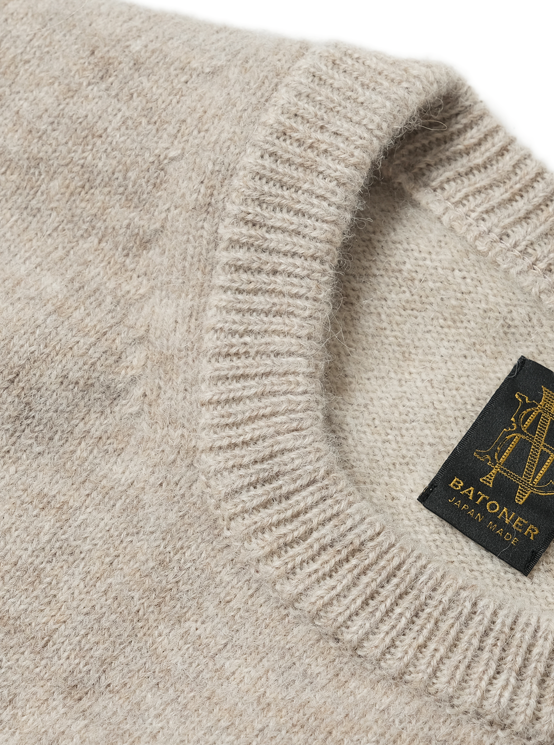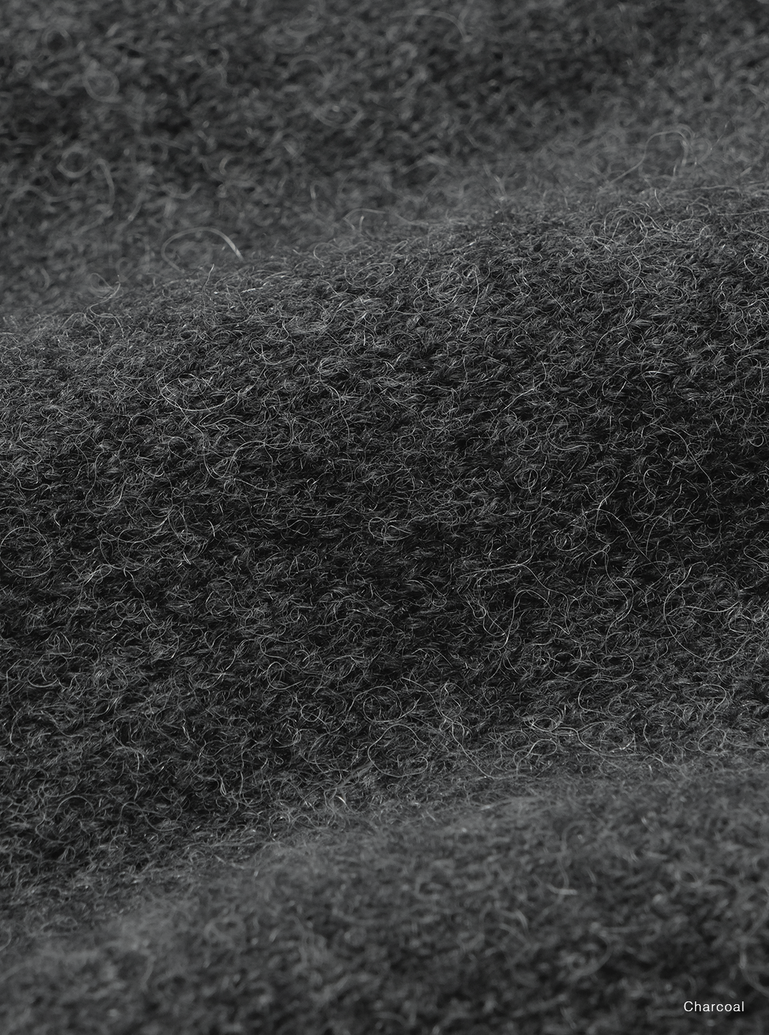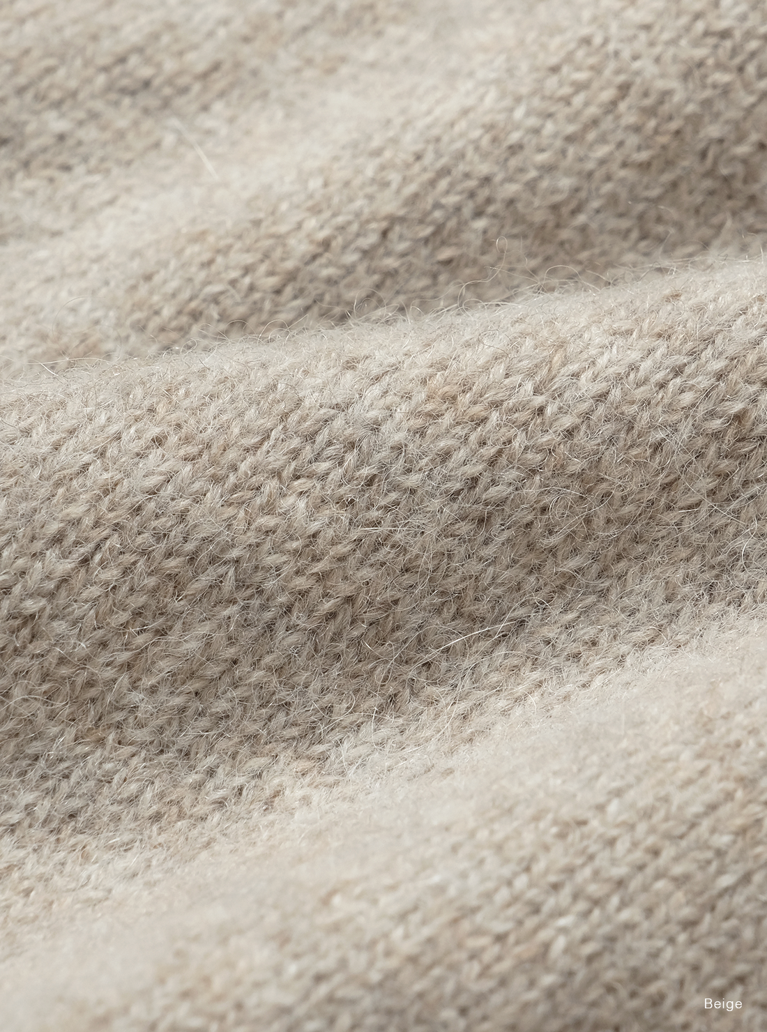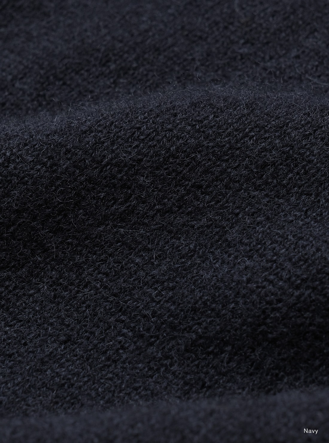 良質なベビーアルパカを絶妙な色差で染め分け、クルミ編みで仕上げた独特の雰囲気を持つ商品。表糸と裏糸にあえて異なる色を用いることで、表裏で異なる表情が生まれ、立体感と深みのある風合いが特徴。ベビーアルパカならではの膨らみと空気感が生む、温かさが魅力。袖リブは長めで折り返しても着用可能。