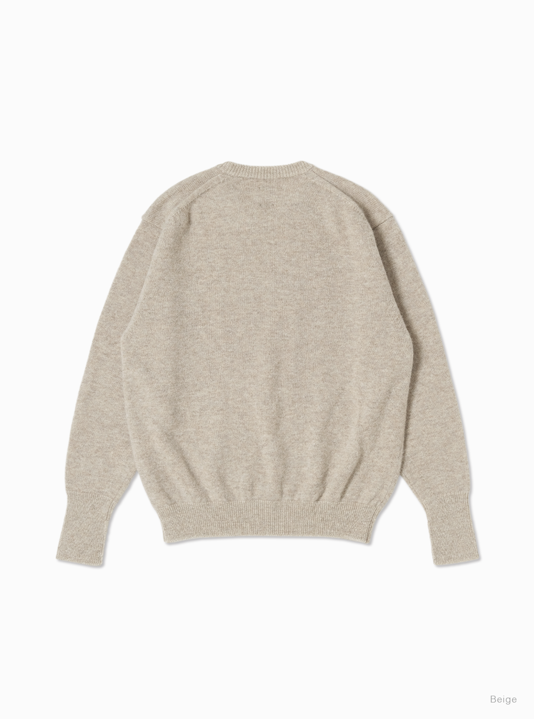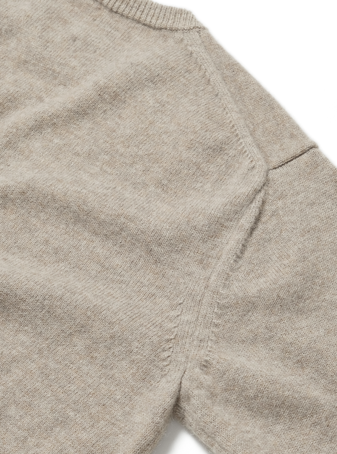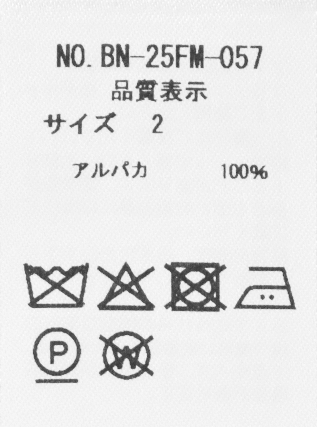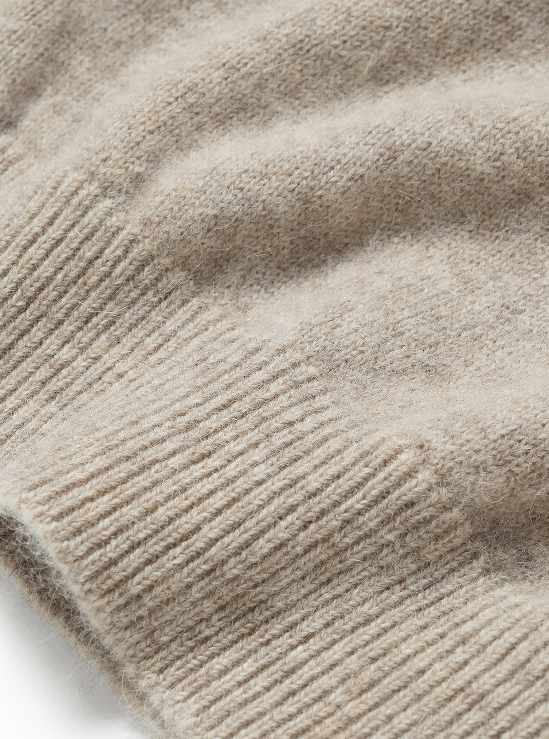 良質なベビーアルパカを絶妙な色差で染め分け、クルミ編みで仕上げた独特の雰囲気を持つ商品。表糸と裏糸にあえて異なる色を用いることで、表裏で異なる表情が生まれ、立体感と深みのある風合いが特徴。ベビーアルパカならではの膨らみと空気感が生む、温かさが魅力。袖リブは長めで折り返しても着用可能。