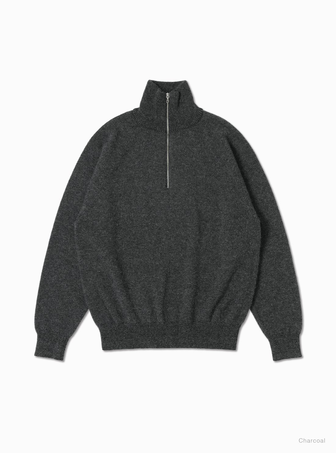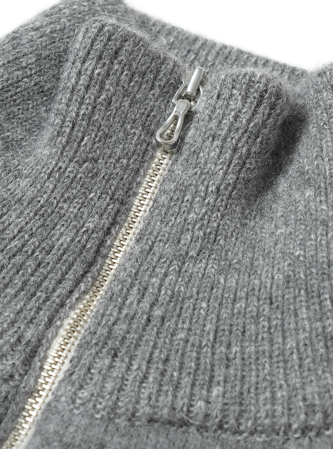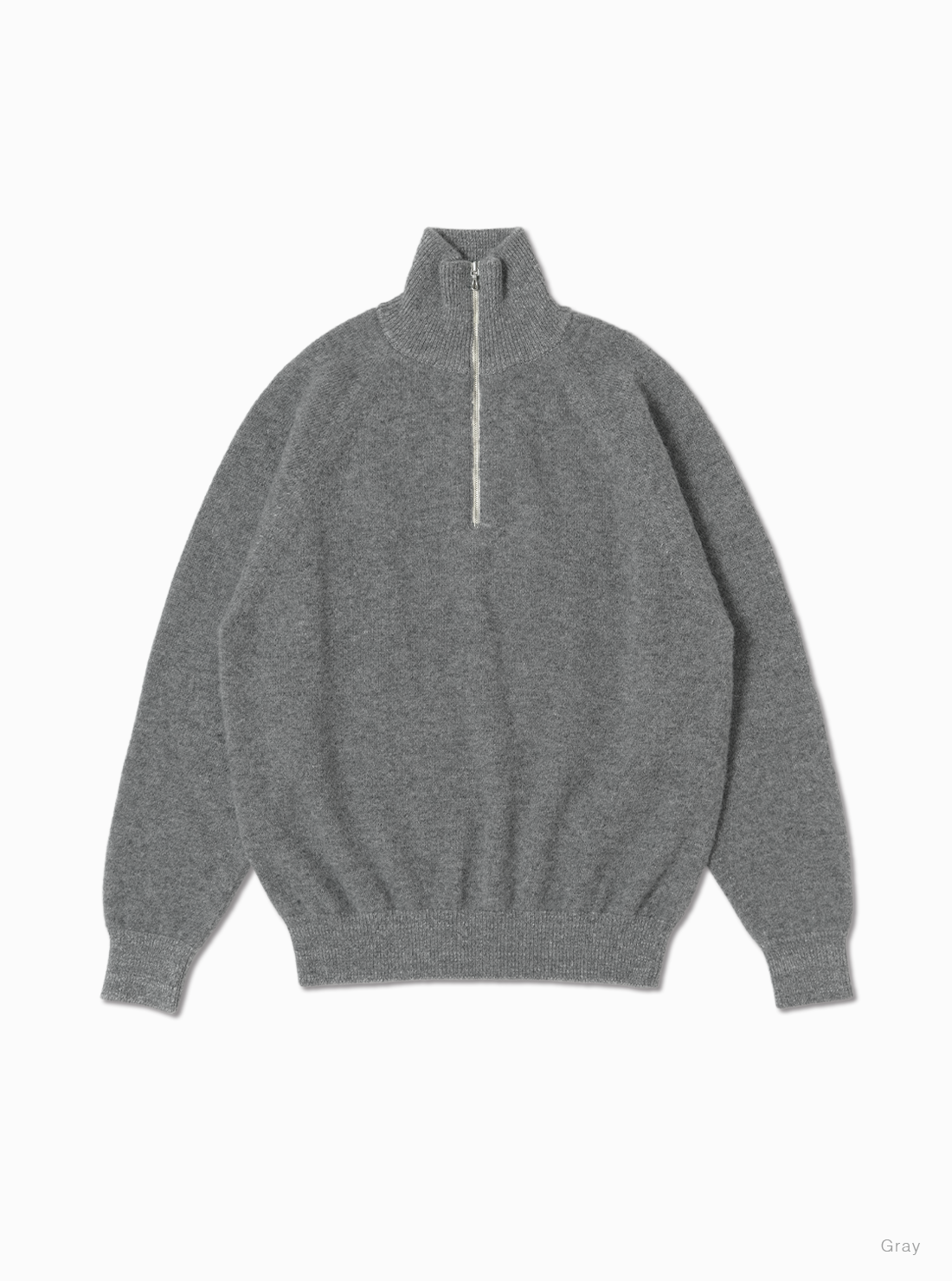 良質なベビーアルパカを絶妙な色差で染め分け、クルミ編みで仕上げた独特の雰囲気を持つ商品。表糸と裏糸にあえて異なる色を用いることで、表裏で異なる表情が生まれ、立体感と深みのある風合いが特徴。ベビーアルパカならではの膨らみと空気感が生む、温かさが魅力。袖リブは長めで折り返しても着用可能。高めのネックと、胸元まで深く開けられるハーフジップ。