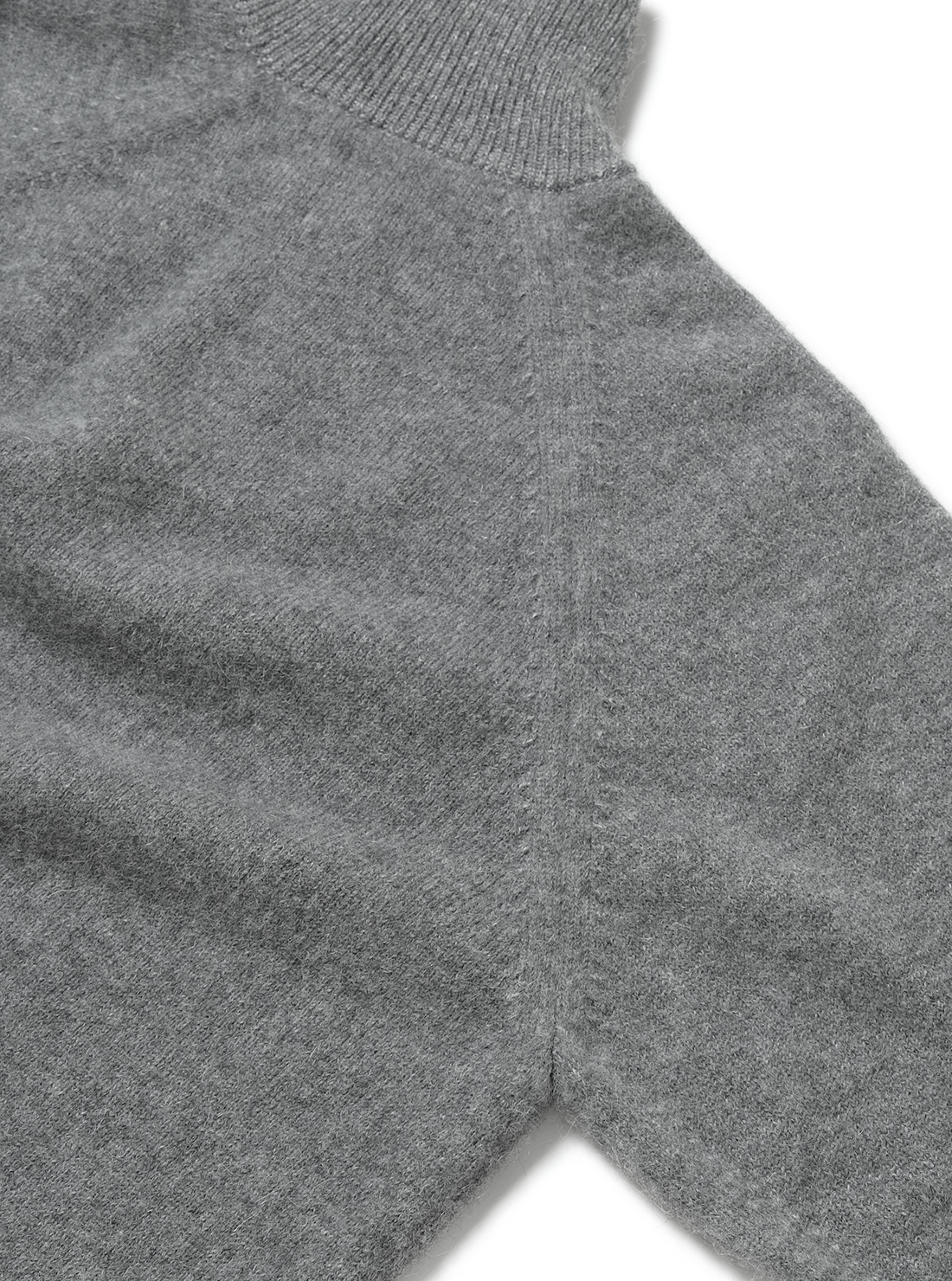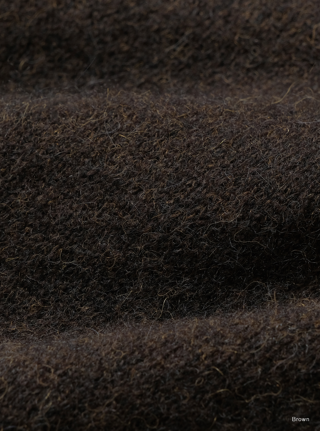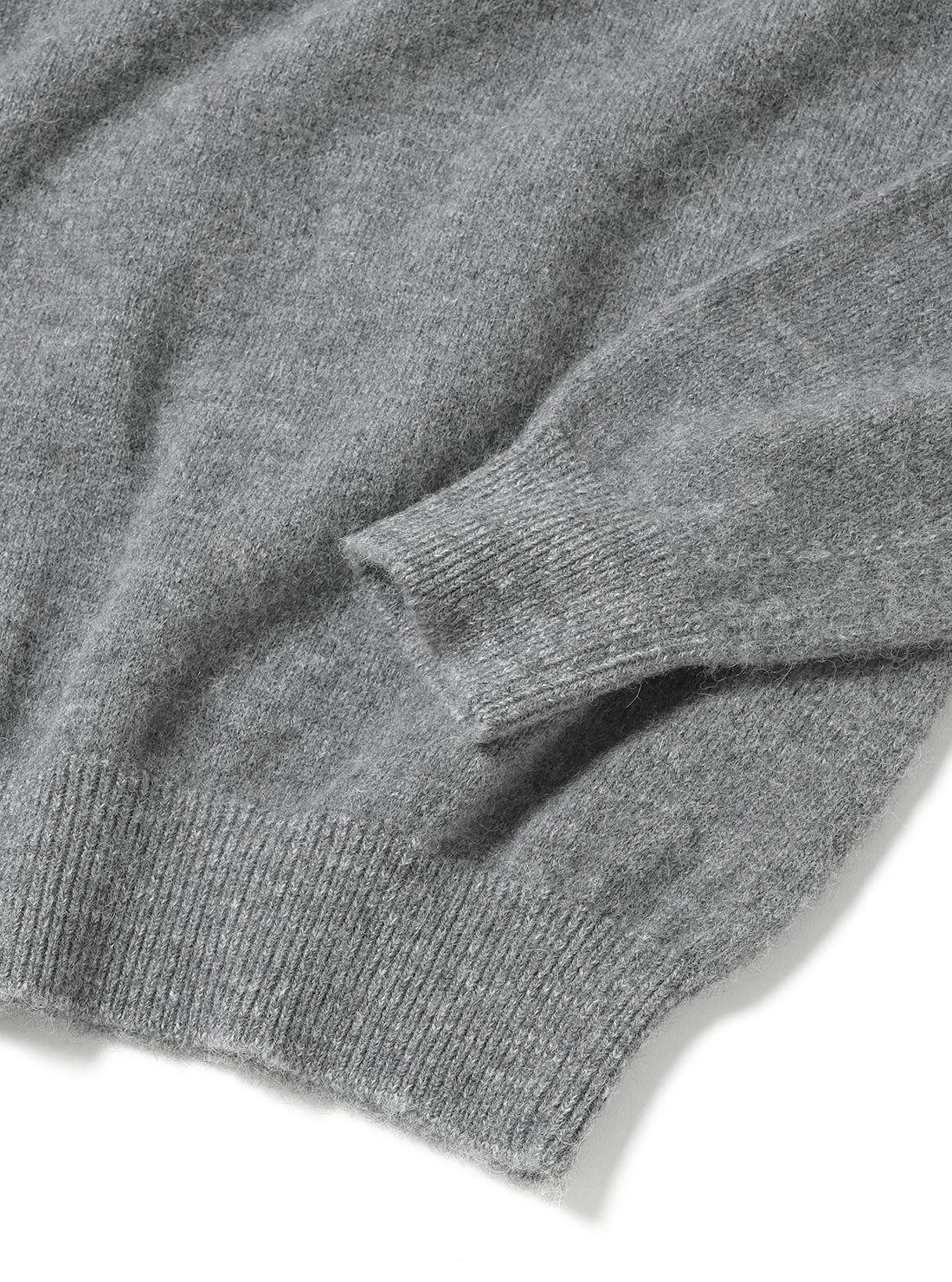 良質なベビーアルパカを絶妙な色差で染め分け、クルミ編みで仕上げた独特の雰囲気を持つ商品。表糸と裏糸にあえて異なる色を用いることで、表裏で異なる表情が生まれ、立体感と深みのある風合いが特徴。ベビーアルパカならではの膨らみと空気感が生む、温かさが魅力。袖リブは長めで折り返しても着用可能。高めのネックと、胸元まで深く開けられるハーフジップ。