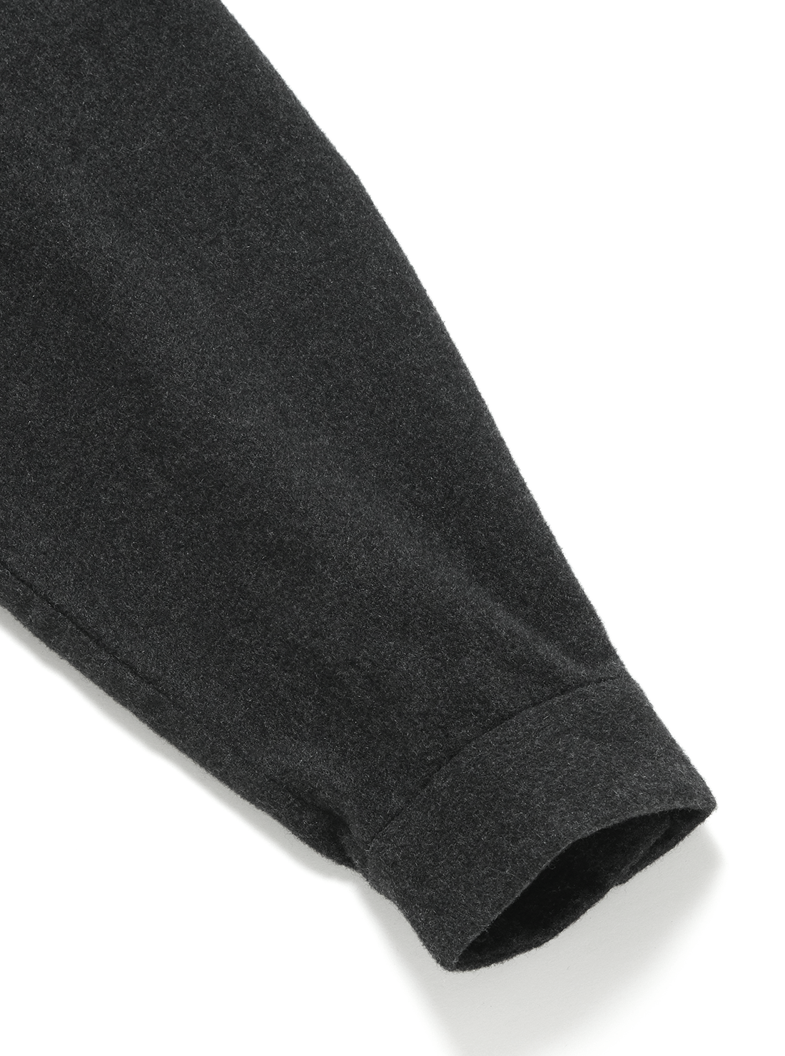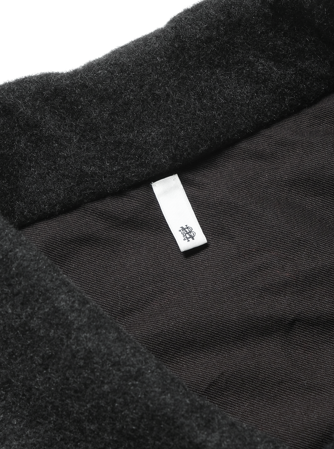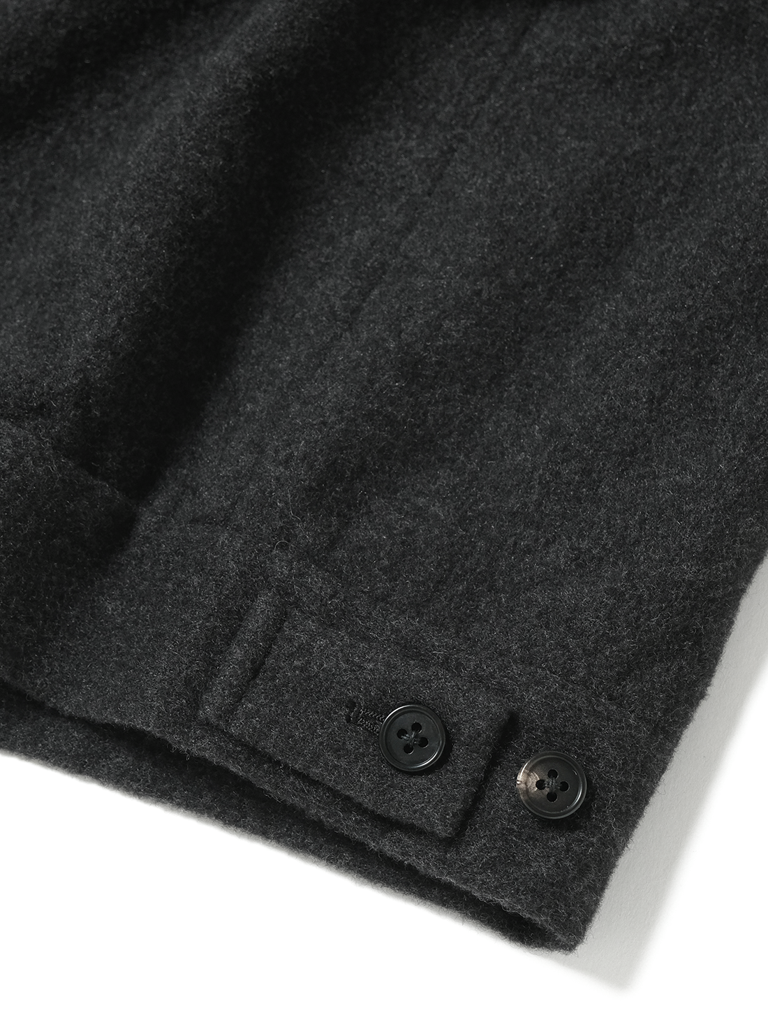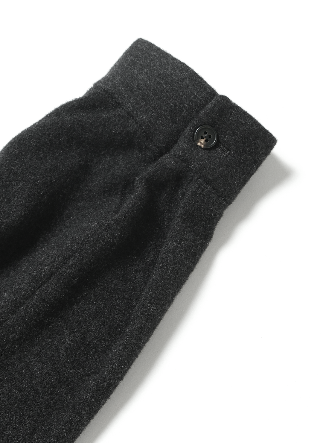 ニット用に紡績された紡毛カシミヤに甘く撚りをかけて生地に仕立て、さらにニット用の縮絨加工を施すことで、布帛でありながらニットのような柔らかさと膨らみを実現。裾にはサイドアジャスター付き。