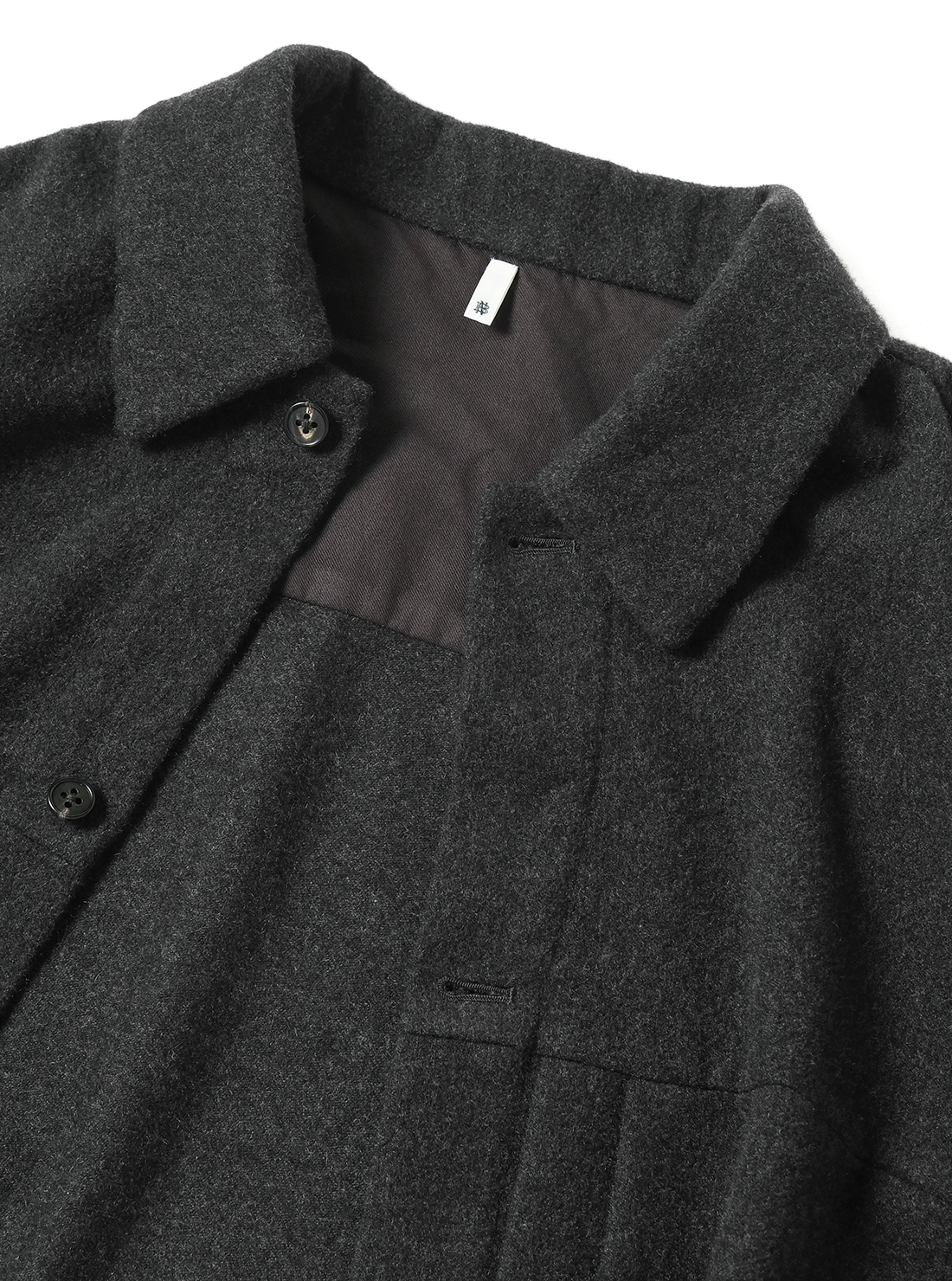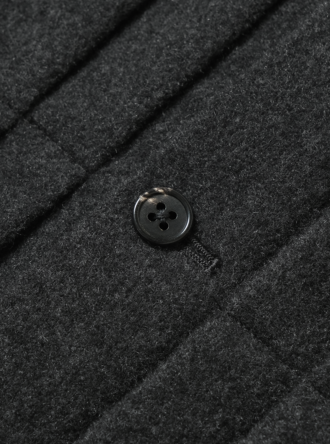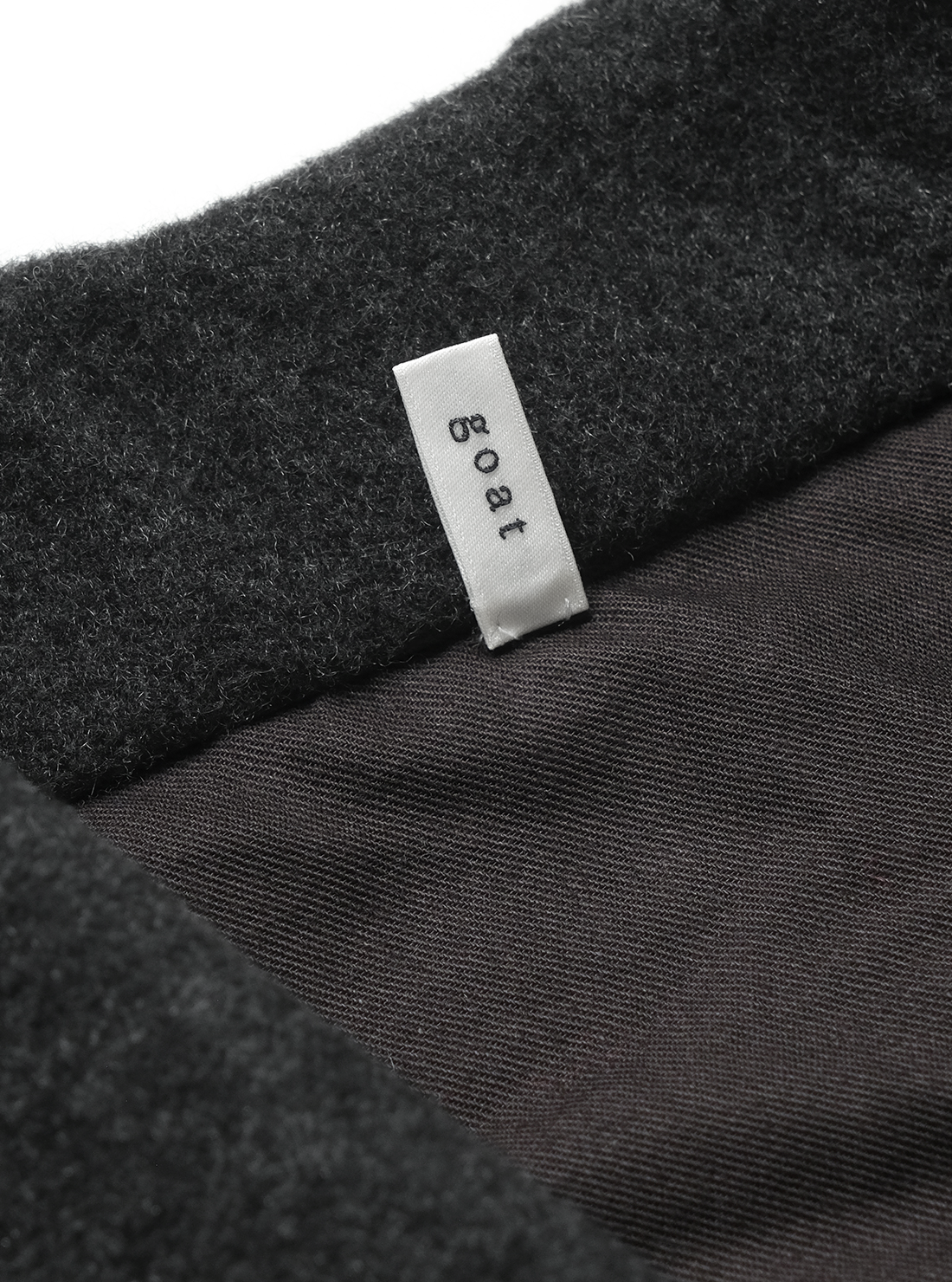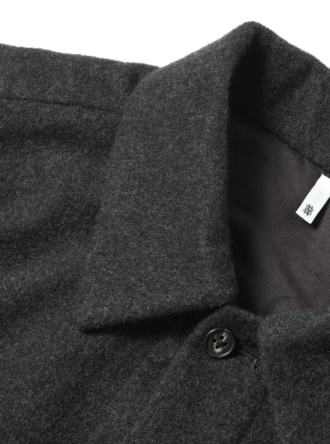 ニット用に紡績された紡毛カシミヤに甘く撚りをかけて生地に仕立て、さらにニット用の縮絨加工を施すことで、布帛でありながらニットのような柔らかさと膨らみを実現。裾にはサイドアジャスター付き。