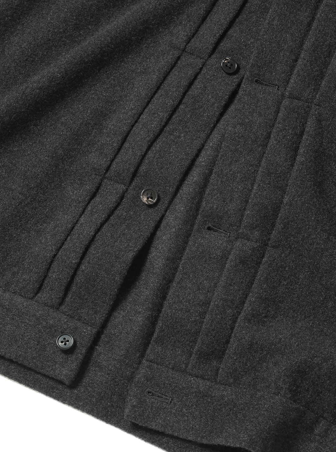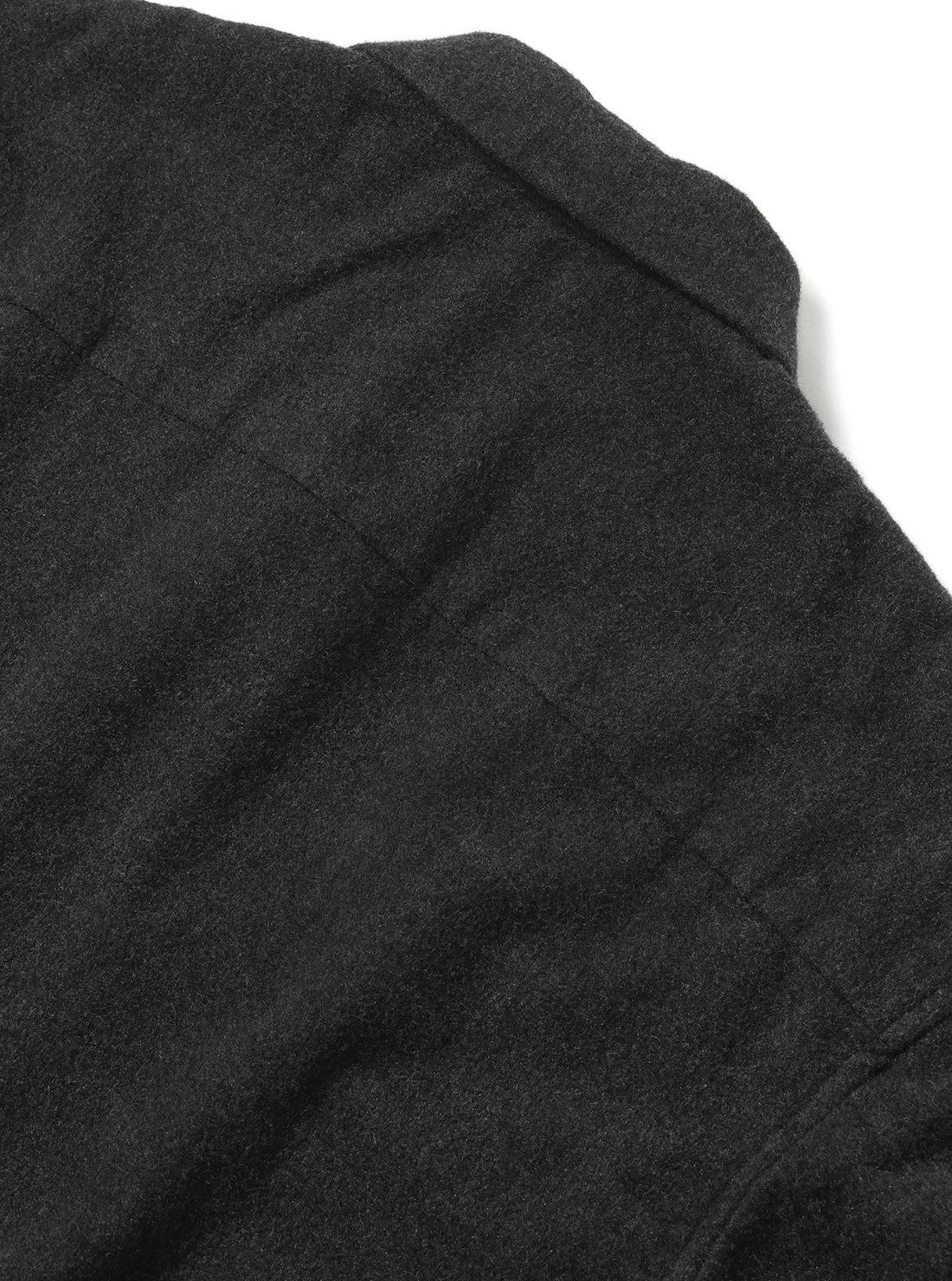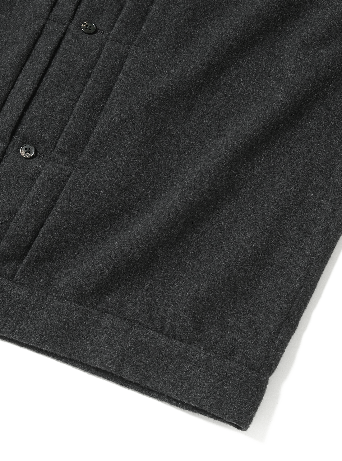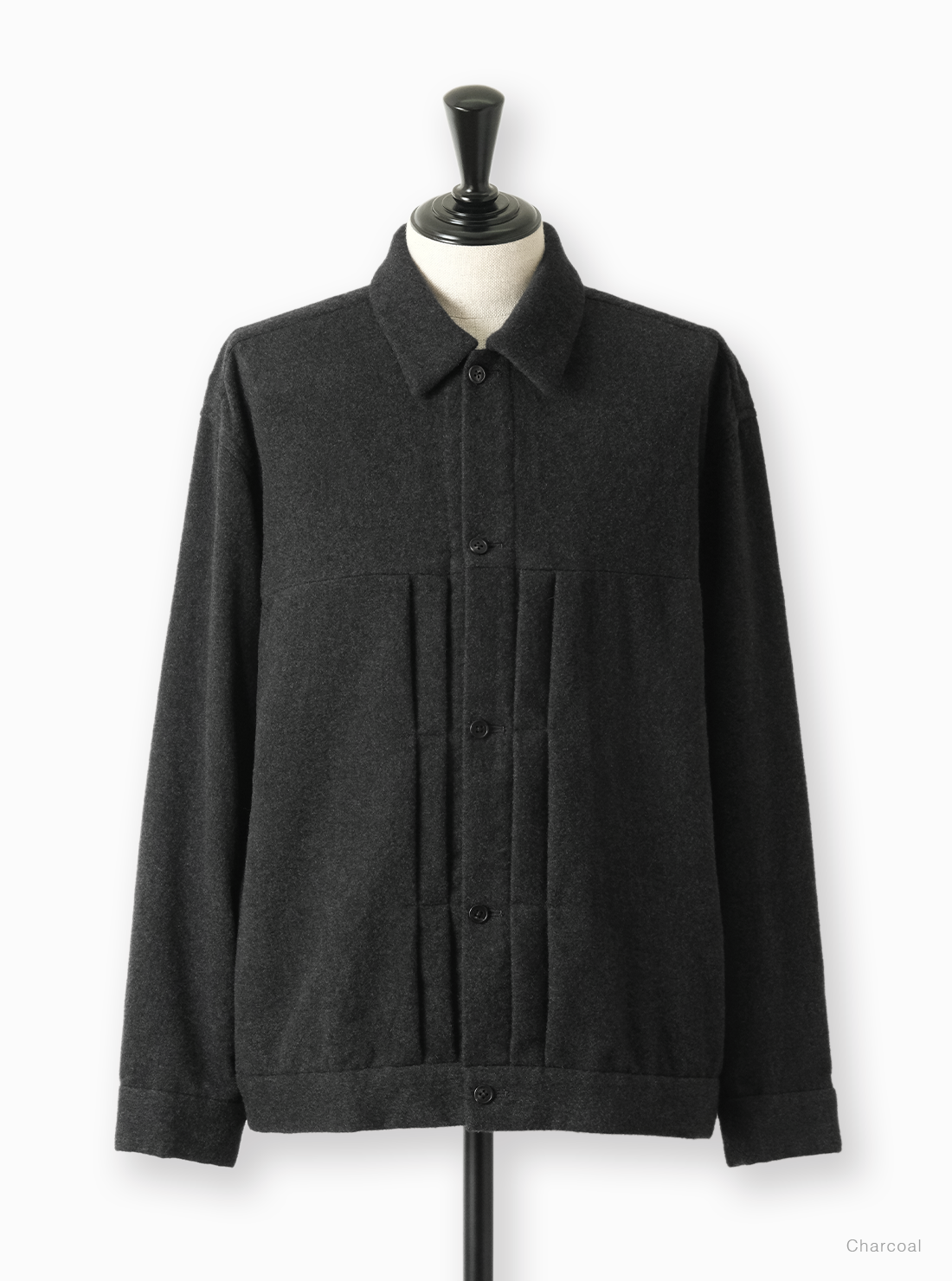 ニット用に紡績された紡毛カシミヤに甘く撚りをかけて生地に仕立て、さらにニット用の縮絨加工を施すことで、布帛でありながらニットのような柔らかさと膨らみを実現。裾にはサイドアジャスター付き。